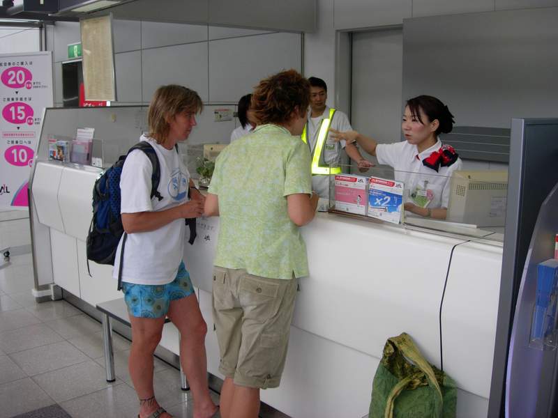 Here is Cheryl working with Japan Airlines (JAL) to figure out our new route. JAL took great care of us, finding our alternatives and paying for